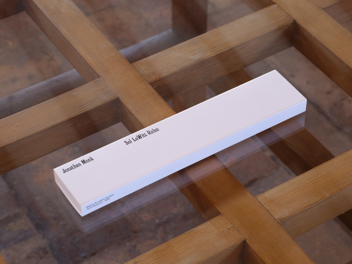 La prima mostra di Jonathan Monk presso la galleria parigina di Yvon Lambert risale al 1997. Da quell'anno, Monk ha continuato a lavorare con lui fino alla chiusura della galleria nel 2014. A un certo punto, nei primi anni 2000, Yvon ha donato a Monk un righello, con impresse le iniziali SL, dichiarando che vent'anni prima Sol LeWitt l'aveva lasciato in galleria dopo aver installato una mostra. Questo righello di 30 cm è stato il punto di partenza per la pubblicazione e l'edizione di 100 righelli in ceramica che essa documenta. I righelli di Jonathan Monk non sono dritti, non hanno numeri né linee e ognuno è leggermente diverso dall'altro. Il processo utilizzato è quello dell'estrusione, per il quale si spinge manualmente l'argilla attraverso un profilo metallico realizzato esattamente come il righello originale donato all'artista da Yvon Lambert. Sol LeWitt Rules è stato prodotto presso lo storico laboratorio di ceramica La Gioconda di Deruta, che negli anni Ottanta ha lavorato a stretto contatto con Sol LeWitt per la produzione di piatti e piastrelle in ceramica. Il libro comprende 100 fotografie dei 100 righelli realizzati in occasione della mostra SL di Jonathan Monk alla Torre Bonomo di Spoleto. Più lo si sfoglia, più si muove velocemente.