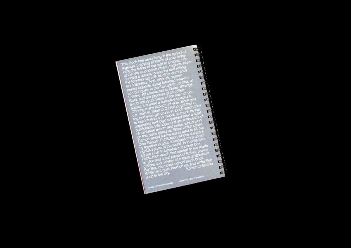 Quasi-Book è un libro d'artista di Kolxoz Collective, ultimo tassello del progetto di residenza dallo stesso titolo curato da Mahler & LeWitt Studios e Viaindustriae nel 2021. La residenza si è svolta negli spazi dello studio di Sol LeWitt a Spoleto ed è stata intesa come piattaforma per la disseminazione e la contestualizzazione della pratiche artistiche editoriali. Dopo essere stato uno studio aperto e generativo, una libreria temporanea, una piattaforma per la condivisione e la discussione delle pratiche editoriali e uno spazio per momenti conviviali, il progetto Quasi-Book è ora diventato un “vero” quasi-libro. I suoi capitoli sono quasi-capitoli, che raccolgono materiali secondo le caratteristiche e le tecniche predominanti utilizzate dal Collettivo Kolxoz. Ad esempio, la promozione di un “interlinguaggio” comune per facilitare nuove modalità di comunicazione e di identificazione collettiva (Glossary); l'uso del servizio postale per consegnare materiali, opere d'arte e disegni ai collaboratori (Post Bridge); la tecnica di stampa termica utilizzata da Kolxoz come elemento editoriale trasportabile (Other Books); e i disegni-statements che fondono brevi testi e informazioni visive (Diagrams). Questi materiali sono accompagnati da un estratto di una conversazione - che si propone come un “dizionario dal vivo” - tra il Collettivo Kolxoz, Viaindustriae e gli studi Mahler & LeWitt).