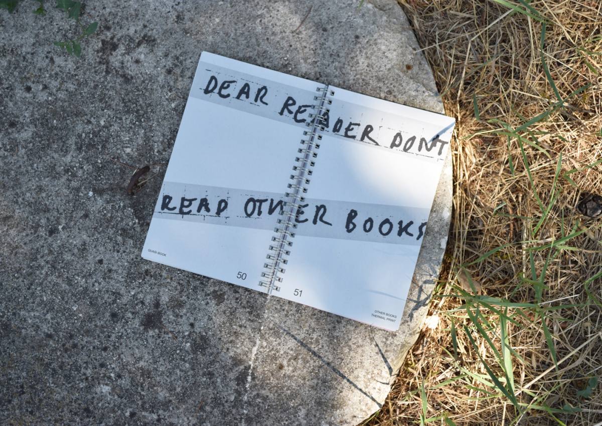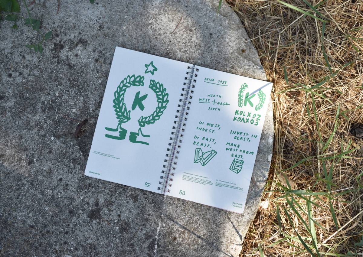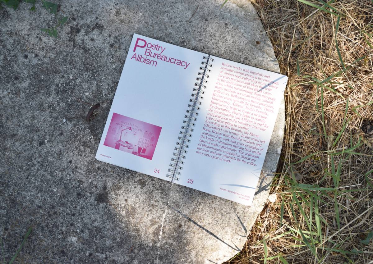 Quasi-Book è un libro d'artista di Kolxoz Collective, ultimo tassello del progetto di residenza dallo stesso titolo curato da Mahler & LeWitt Studios e Viaindustriae nel 2021. La residenza si è svolta negli spazi dello studio di Sol LeWitt a Spoleto ed è stata intesa come piattaforma per la disseminazione e la contestualizzazione della pratiche artistiche editoriali. Dopo essere stato uno studio aperto e generativo, una libreria temporanea, una piattaforma per la condivisione e la discussione delle pratiche editoriali e uno spazio per momenti conviviali, il progetto Quasi-Book è ora diventato un “vero” quasi-libro. I suoi capitoli sono quasi-capitoli, che raccolgono materiali secondo le caratteristiche e le tecniche predominanti utilizzate dal Collettivo Kolxoz. Ad esempio, la promozione di un “interlinguaggio” comune per facilitare nuove modalità di comunicazione e di identificazione collettiva (Glossary); l'uso del servizio postale per consegnare materiali, opere d'arte e disegni ai collaboratori (Post Bridge); la tecnica di stampa termica utilizzata da Kolxoz come elemento editoriale trasportabile (Other Books); e i disegni-statements che fondono brevi testi e informazioni visive (Diagrams). Questi materiali sono accompagnati da un estratto di una conversazione - che si propone come un “dizionario dal vivo” - tra il Collettivo Kolxoz, Viaindustriae e gli studi Mahler & LeWitt).