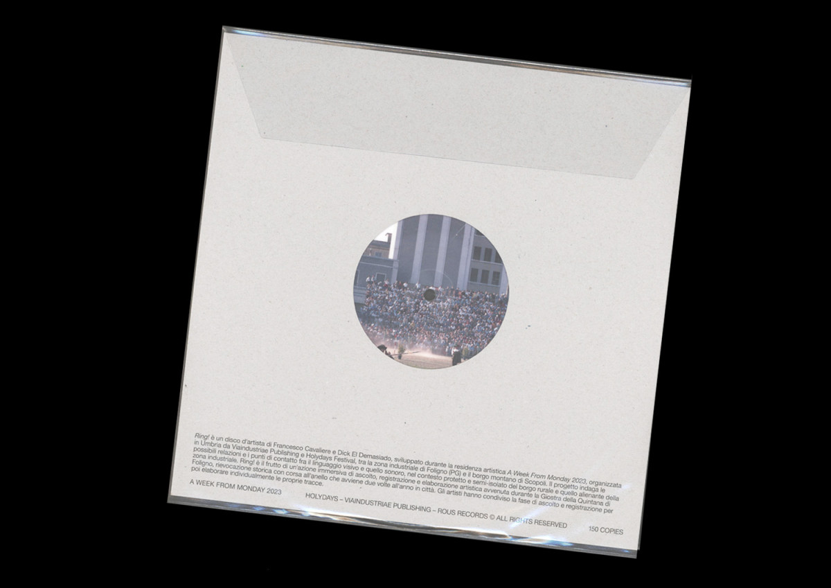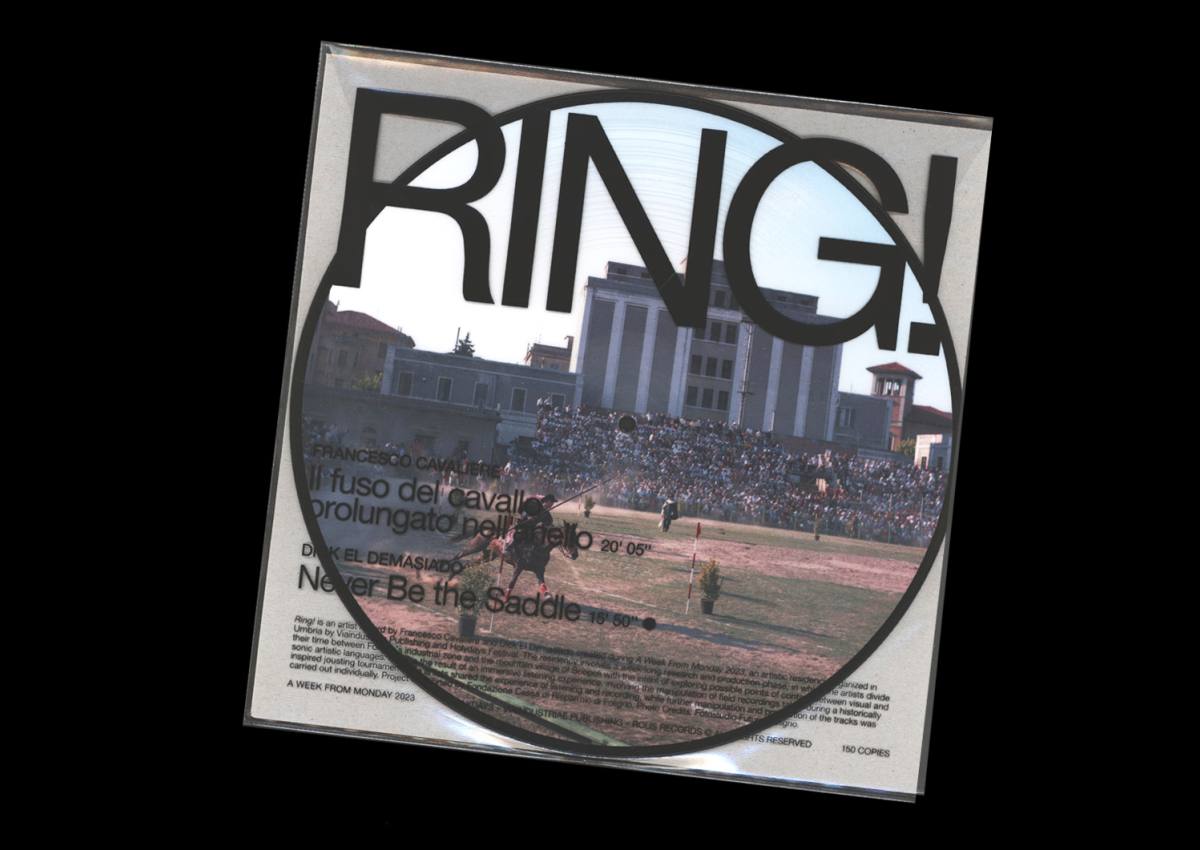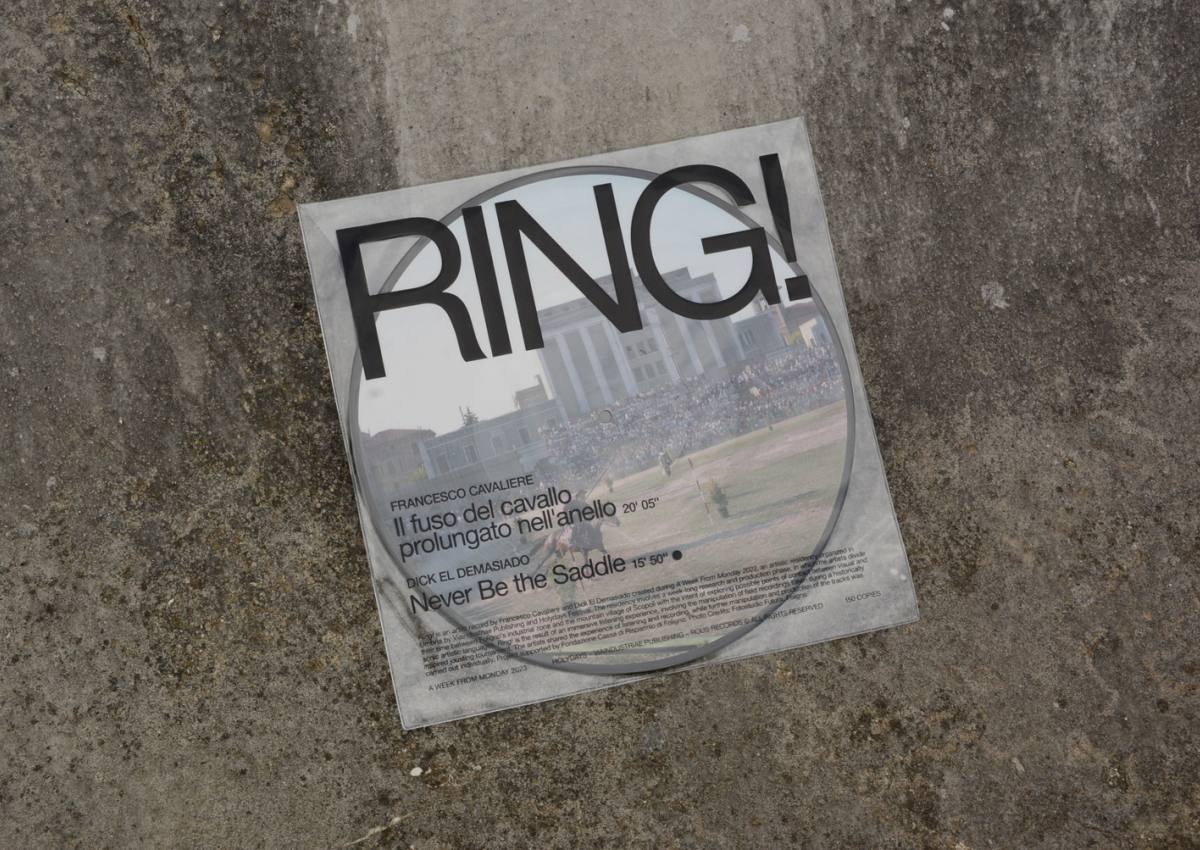Ring! è un disco d'artista di Francesco Cavaliere e Dick El Demasiado, sviluppato durante la residenza artistica A Week From Monday 2023, organizzata in Umbria da Viaindustriae e Holydays Festival, tra la zona industriale di Foligno (PG) e il borgo montano di Scopoli. Il progetto indaga le possibili relazioni e i punti di contatto fra il linguaggio visivo e quello sonoro, nel contesto protetto e semi-isolato del borgo rurale e quello alienante della zona industriale. Ring! è il frutto di un'azione immersiva di ascolto, registrazione ed elaborazione artistica avvenuta durante la Giostra della Quintana di Foligno, rievocazione storica con corsa all'anello che avviene due volte all'anno in città. Gli artisti hanno condiviso la fase di ascolto e registrazione per poi elaborare individualmente le proprie tracce. Francesco Cavaliere apre Il fuso del cavallo infilato nell'anello (20' 5") con una reinterpretazione vocale del Bando di Giostra — un testo che annuncia la gara a cavallo, solitamente declamato al microfono il giorno della stessa da un attore designato, nel silenzio totale dello stadio affollato — per poi concentrarsi sulla stridente solennità della corsa, durante la quale una certa forma di silenzio irrequieto è protagonista e l'orecchio si appresta a cogliere i rumori essenziali dello stadio, come il galoppo del cavallo e le lance che infilano o urtano gli anelli. Ne risulta, così, una lunga sequenza di silenzi parlanti in cui — di tanto in tanto — fa irruzione il vociare degli spettatori. In Never Be The Saddle (15' 50"), Dick El Demasiado lavora con il montaggio, la ripetizione, la sovrapposizione, il delay come gesti quasi impercettibili ma determinanti a sufficienza per offrire un'esperienza sonora vagamente perturbante e fuori dall'ordinario, in cui è possibile non accorgersi subito degli interventi dell'artista (o, potenzialmente, di non accorgersene mai). Protagonisti principali qui sono i suoni saturi come la voce amplificata dello speaker di giostra, il tifo, i tamburi e le trombe tra cui si fa spazio, però, lo stesso silenzio parlante che sentiamo nell'altra traccia, evento sonoro caratterizzante dell'esperienza.