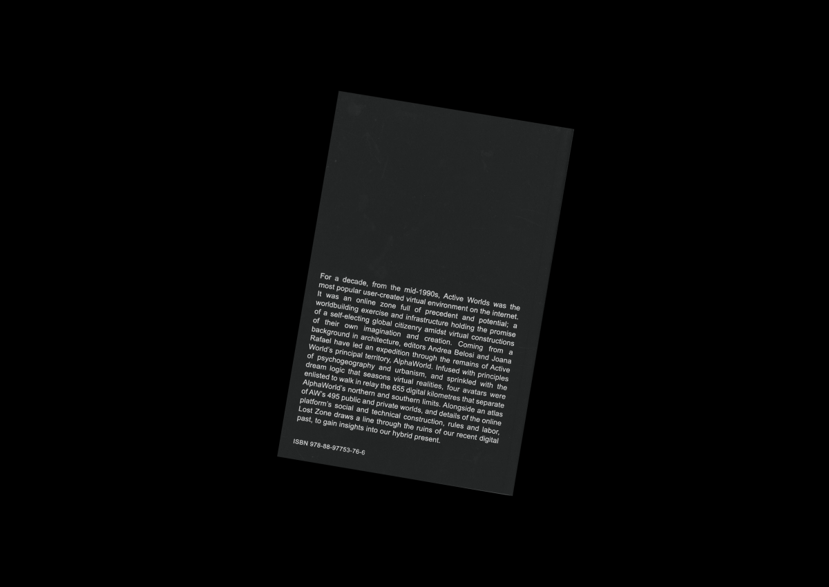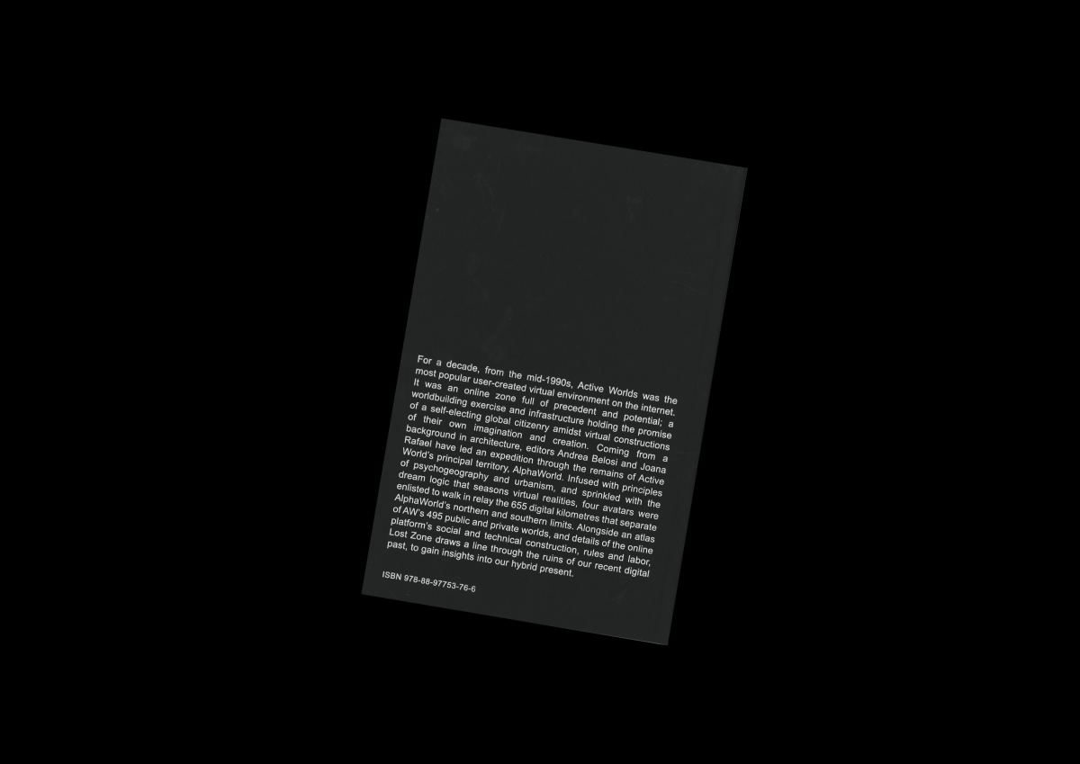 For a decade, from the mid-1990s, Active Worlds was the most popular user-created virtual environment on the internet. It was an online zone full of precedent and potential; a worldbuilding exercise and infrastructure holding the promise of a self-electing global citizenry amidst virtual constructions of their own imagination and creation. Coming from a background in architecture, editors Andrea Belosi and Joana Rafael have led an expedition through the remains of Active World’s principal territory, AlphaWorld. Infused with principles of psychogeography and urbanism, and sprinkled with the dream logic that seasons virtual realities, four avatars were enlisted to walk in relay the 655 digital kilometres that separate AlphaWorld’s northern and southern limits. Alongside an atlas of AW’s 495 public and private worlds, and details of the online platform’s social and technical construction, rules and labor, Lost Zone draws a line through the ruins of our recent digital past, to gain insights into our hybrid present.