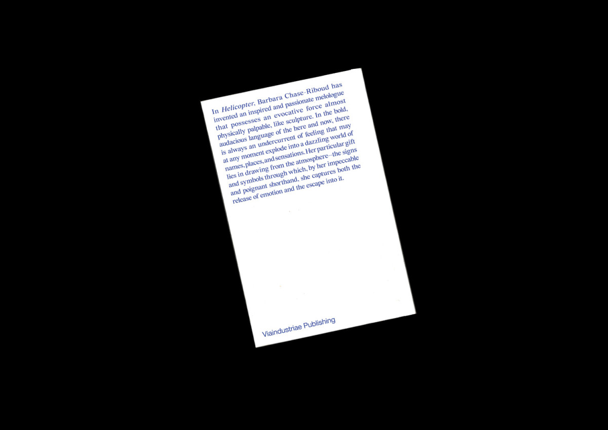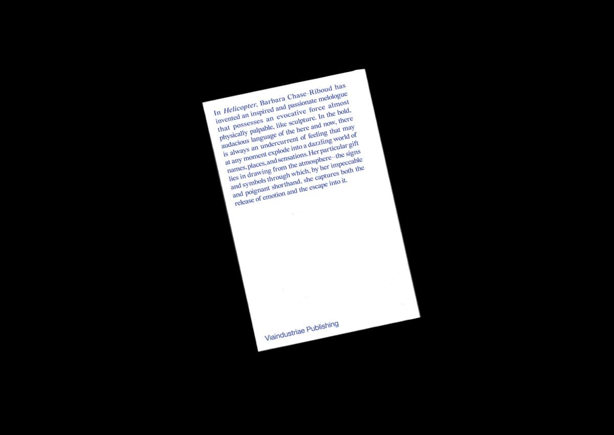 In Helicopter, Barbara Chase-Riboud ha creato un melologo ispirato e appassionato, dotato di una forza evocativa quasi fisicamente palpabile, come una scultura. Nel linguaggio audace e ardito del qui e ora, scorre sempre una corrente sotterranea di sentimento che può, in qualsiasi momento, esplodere in un mondo abbagliante di nomi, luoghi e sensazioni. Il suo dono particolare risiede nella capacità di attingere all’atmosfera—ai segni e ai simboli attraverso i quali, con una sua stenografia impeccabile e toccante, cattura insieme il liberarsi dell’emozione e il rifugio in essa.