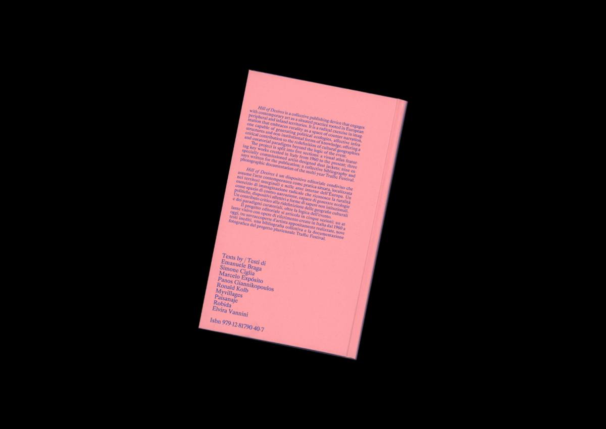Hill of Desires è un dispositivo editoriale condiviso che assume l'arte contemporanea come pratica situata, localizzata nei territori marginali e nelle aree interne dell'Europa. Un esercizio di immaginazione radicale che riconosce la ruralità come spazio di contro-narrazione, capace di generare ecologie politiche, dispositivi affettivi e forme di sapere non istituzionali. Un contributo critico alla ridefinizione delle geografie culturali e dei paradigmi curatoriali, oltre la logica dell'evento. Il progetto editoriale si articola in cinque sezioni: un atlante visivo con opere di riferimento create in Italia dal 1960 a oggi, tre sovraccoperte d'artista appositamente realizzate, nove testi inediti, una bibliografia collettiva e la documentazione fotografica del progetto pluriennale Traffic Festival.