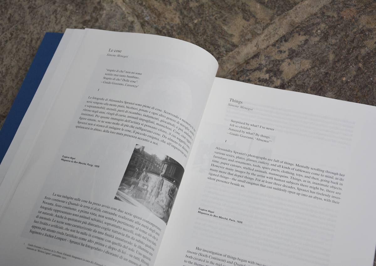 Sviluppato in stretto dialogo con l’artista e con il graphic designer Filippo Nostri, il progetto editoriale si articola lungo percorsi sia cronologici sia tematici. Il volume espone l’evoluzione della pratica di Spranzi mettendo in primo piano una serie di motivi ricorrenti che attraversano e strutturano costantemente la sua ricerca, come la tensione tra scala e intimità, la circolazione e trasformazione delle immagini e l’oscillazione tra realtà e meraviglia.