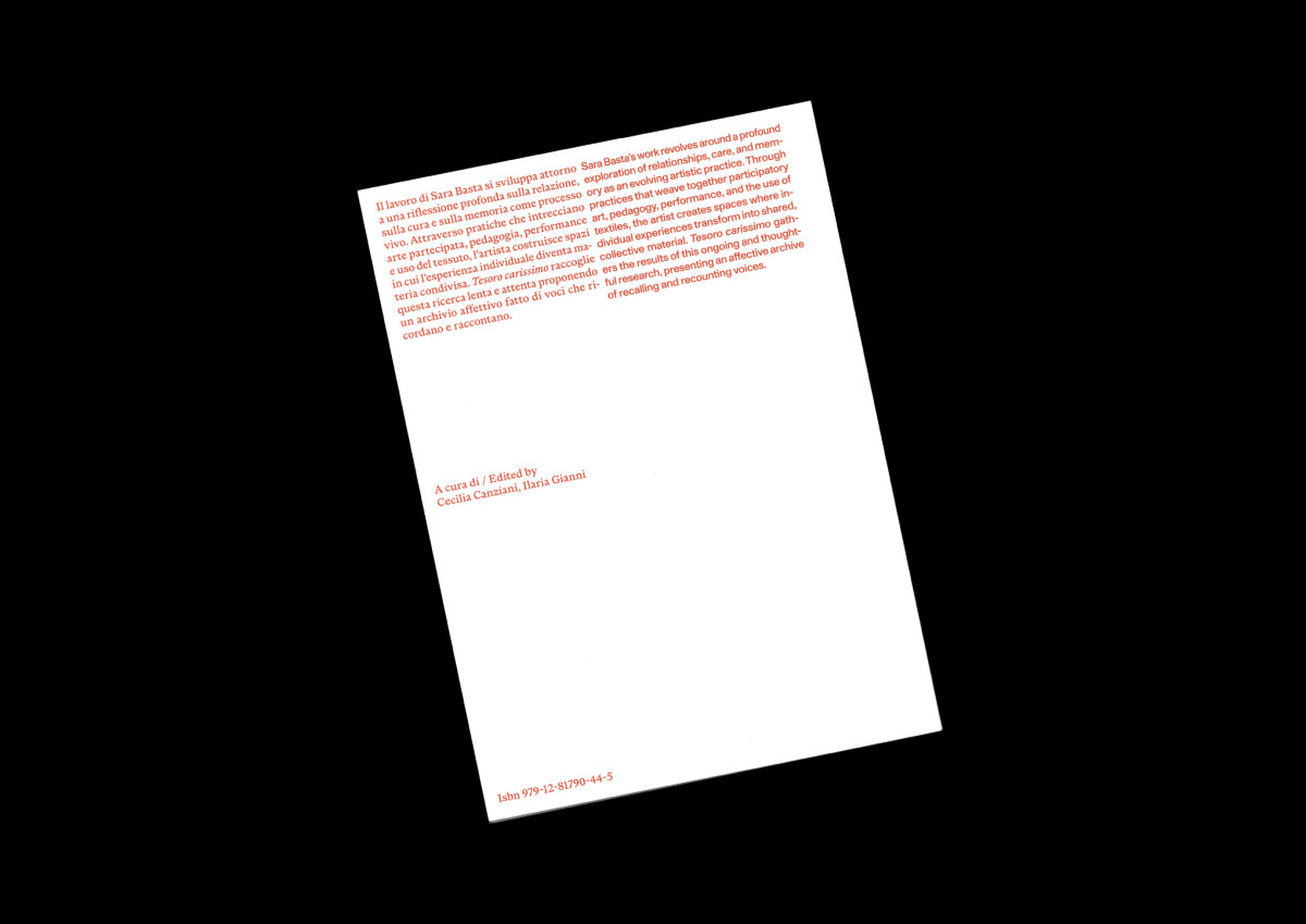 Il lavoro di Sara Basta si sviluppa attorno a una riflessione profonda sulla relazione, sulla cura e sulla memoria come processo vivo. Attraverso pratiche che intrecciano arte partecipata, pedagogia, performance art, e uso del tessuto, l'artista costruisce spazi in cui l'esperienza individuale diventa materia condivisa. Tesoro carissimo raccoglie questa ricerca lenta e attenta proponendo un archivio affettivo fatto di voci che ricordano e raccontano.
