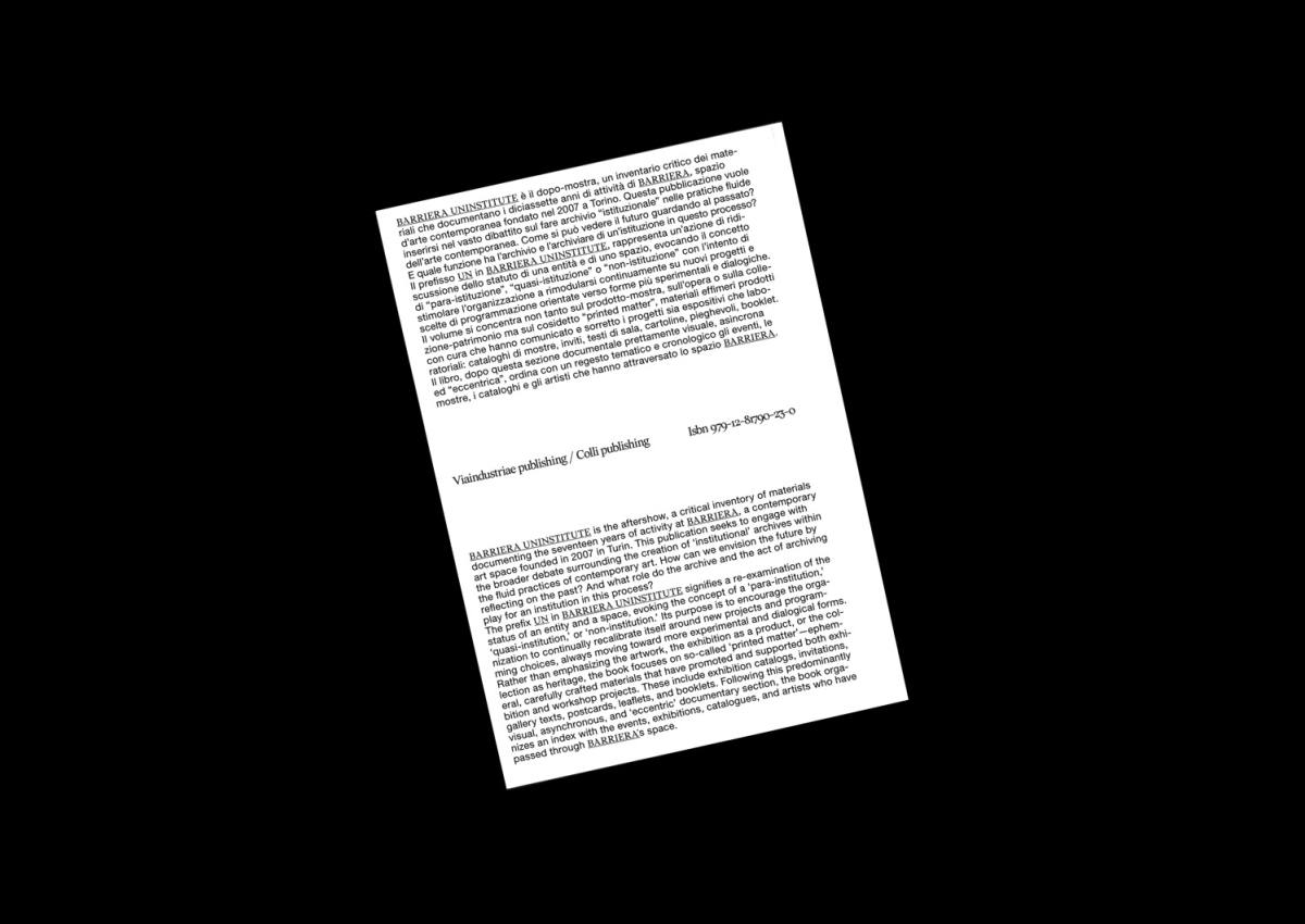 BARRIERA UNINSTITUTE is the aftershow, a critical inventory of materials documenting the seventeen years of activity at BARRIERA, a contemporary art space founded in 2007 in Turin. This publication seeks to engage with the broader debate surrounding the creation of 'institutional' archives within the fluid practices of contemporary art. How can we envision the future by reflecting on the past? And what role do the archive and the act of archiving play for an institution in this process?