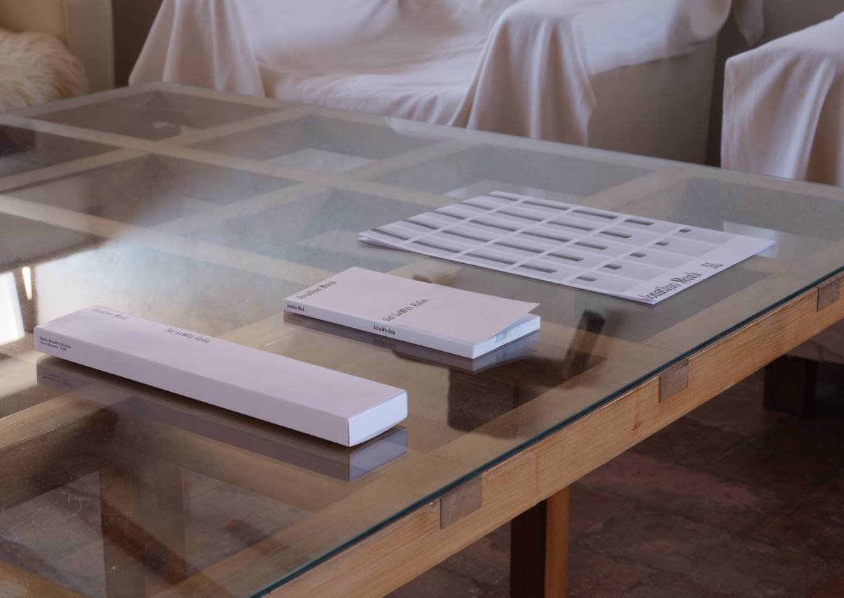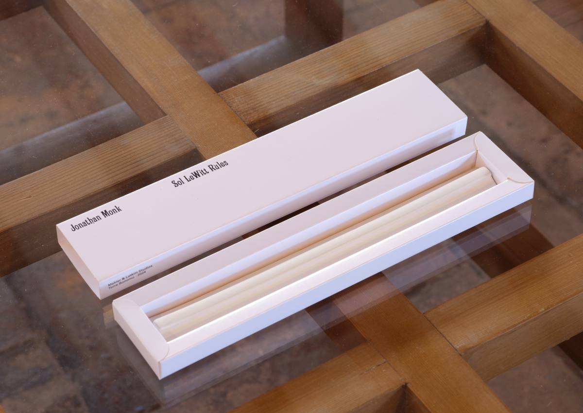 A new series of sculptures by Jonathan Monk titled Sol LeWitt Rules (ceramic, approx. 30 x 3 x 1.5 cm, 2024), produced by Fabio Veschini at the ceramic workshop La Gioconda in Deruta which worked closely with Sol LeWitt on the production of ceramic plates and tiles. Monk created the edition as part of his residency at the Mahler & LeWitt Studios and subsequent exhibition ‘SL’ in the Torre Bonomo for the Spoleto Festival dei Due Mondi 67, curated by Vittoria Bonifati. The exhibition explored the direct and indirect connections between the work of Monk and LeWitt (see installation photographs of the rulers in ‘SL’ below and the related exhibition page here).