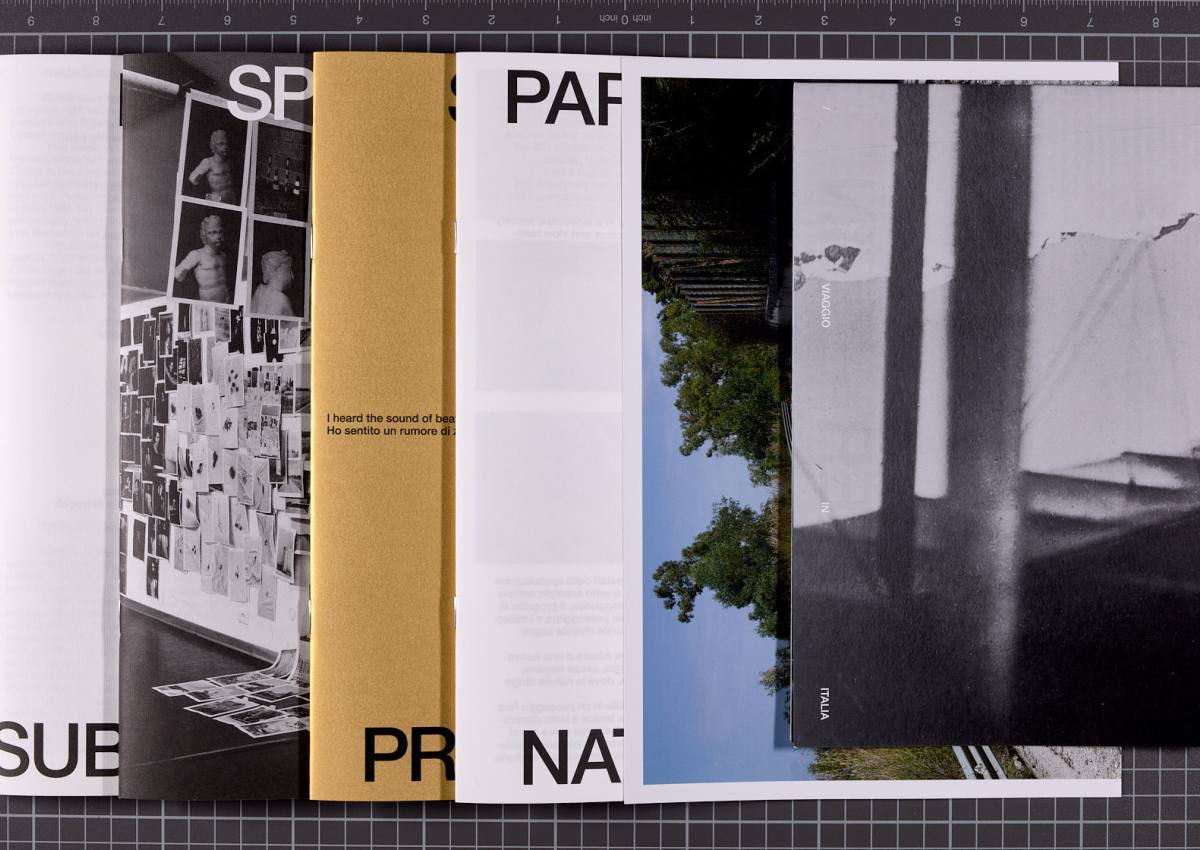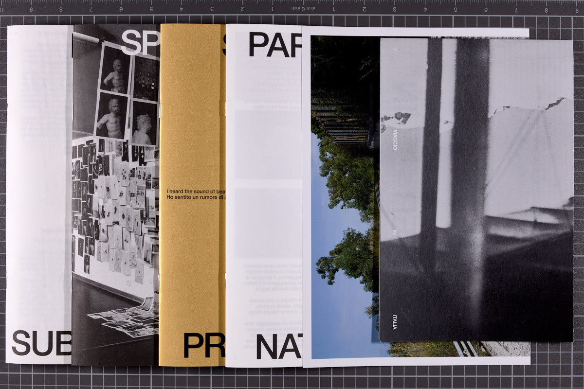 The editorial project Master in Photography / Viaggio in Italia–composed of four photographic zines and two posters–gathers the outcomes of the 2021, 2022, and 2023 activities of the Master in Photography at the IUAV University in Venice. Presented in its itinerant and experimental form, the project involved a series of residencies across Italy dedicated to photography, designed and structured in collaboration with guest lecturers to strengthen the relationship with the context and with Italy's social and natural landscape. The Master in Photography proposed a geographical exploration that also became metaphorical, crossing different grounds and distant territories. The group, composed of participants, lecturers and the people they met along the way, forms a context of permanent discussion and growth. The editorial project is a co-edition by Viaindustriae, ICCD, a+mbookstore, lUAV University in Venezia and Master in Photography cultural association. Over the past five years, the ICCD has become a valuable partner for all those involved, by offering access to its photographic archive and, through these publications, identifying a form of permanence – conceptual and concrete – of the experiences. The four published issues are dedicated to four different workshops; in each residency, the instructors presented an initial research theme from which the students developed a personal project. All of the residencies took place through a multi-vocal conversation in collaboration with institutions and realities spread throughout the territory. The four published issues are dedicated to four different workshops; in each residency, the instructors presented an initial research theme from which the students developed a personal project. All of the residencies took place through a multi-vocal conversation in collaboration with institutions and realities spread throughout the territory .Stefano Graziani and Emanuele De Donno curated the residency Roma subalterna, with the aim of investigating the utopia of drafting a guide to the city, drawing on unpublished bibliographies, exo-editorial models, neighbourhood guides of the capital, and adventure diaries. Spettri, the publication dedicated to Villa Manin, with Jacopo Benassi and curated by Saul Marcadent, envisaged a polyphonic collective journey where photography is to be understood as a permeable language in dialogue with performance, sound, and publishing. Filippo Romano’s Paradigma naturale places nature at the centre of the narrative, articulating a taxonomy of stories in images, collected in the freest manner. In the same issue, José Pedro Cortes’ workshop A Future Ruin perhaps most explicitly presents a reflection on time: everything in the images immediately becomes a ruin, a (non-decisive) instant to which one never returns. Senza preavviso, the fanzine dedicated to Gibellina hosts the visual research of Alessandra Spranzi, who has paused to observe, with her delicate gaze, some ordinary aspects of life in an attempt to find her own possible point of observation.