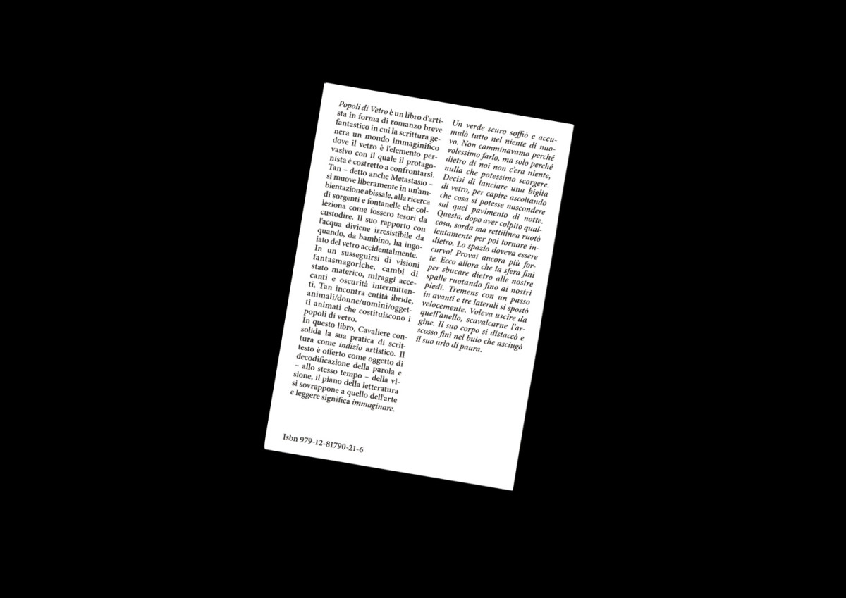 Popoli di Vetro is an artist's book in the form of a fantastical novella. Here, the writing generates an imaginative world in which glass is the pervasive element the protagonist must deal with.